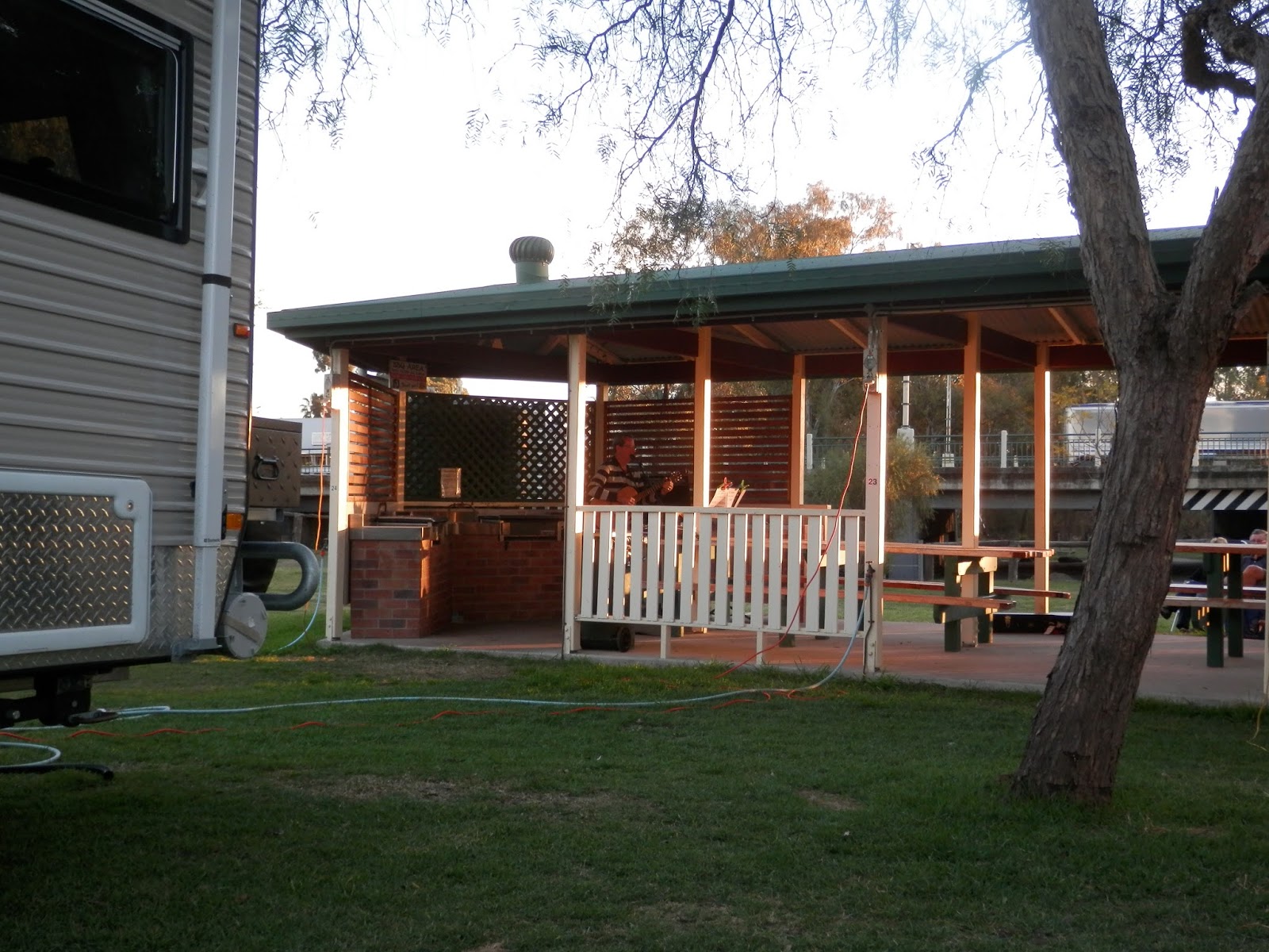 Our campsite at Dalby,QLD, the camp kitchen behind us. Hard to see but 2 musicians playing country songs at the left of the kitchen. Plonked our chairs outside & enjoyed the free concert.
